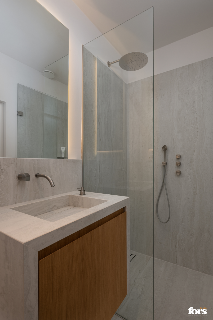 In het interieur hebben we gekozen voor maatwerk kasten met eiken fineer en geïntegreerde greeplijsten. De greeploze lades zijn voorzien van Blum lades en sluiten geruisloos. Elk detail is ontworpen op eenvoud, gebruiksgemak en warme elegantie. In het toilet en de badkamer lopen materialen en kleuren mooi door, wat zorgt voor rust en eenheid in het hele ontwerp.